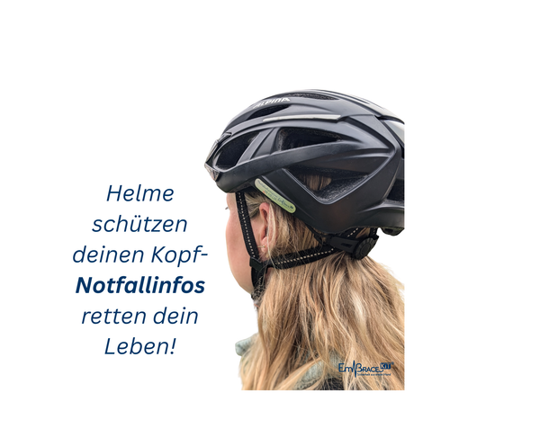 AUßEN: refkletierend die Info platziert, dass der Helm Notfallinformationen dabei hat!