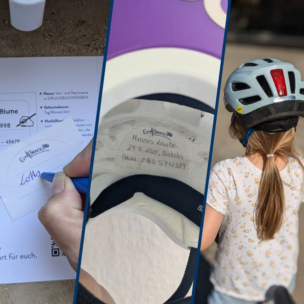 Trage die wichtigsten Notfallinformationen auf den reflektierenden Aufkleber ein.Wichtige Hinweise zu Allergien und Medikamente findest du hier oder kontaktiere uns Jederzeit!