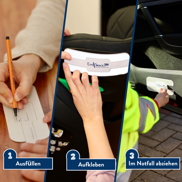 Bringe den EmbraceKit-Aufkleber gut sichtbar am Kindersitz oder im Auto an. Hinweisaufkleber und Pfeile helfen zusätzlich, das Kit schnell zu finden.